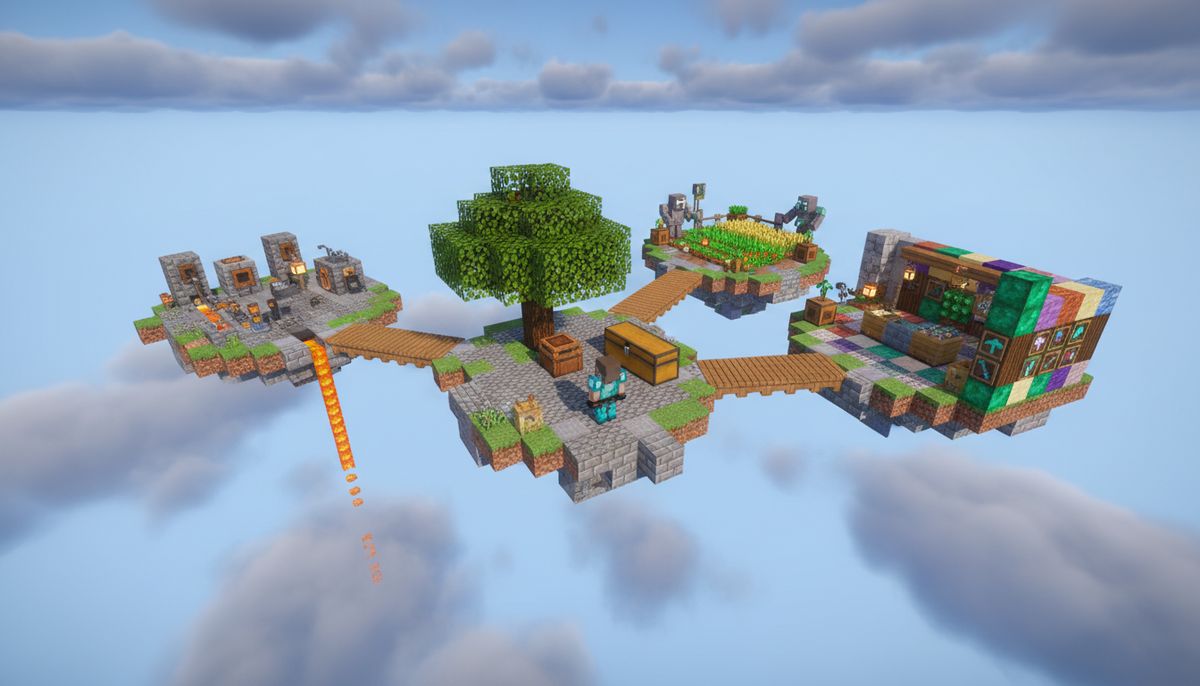 Задачи Skyblock определяли Minecraft геймплей выживания более десяти лет. Игроки появляются на крошечном летающем острове с минимальными ресурсами и должны расширяться, выживать и процветать в пустоте. Режим требует творчества, управления ресурсами и навыков решения проблем, которые превращают простое размещение блоков в стратегический геймплей.